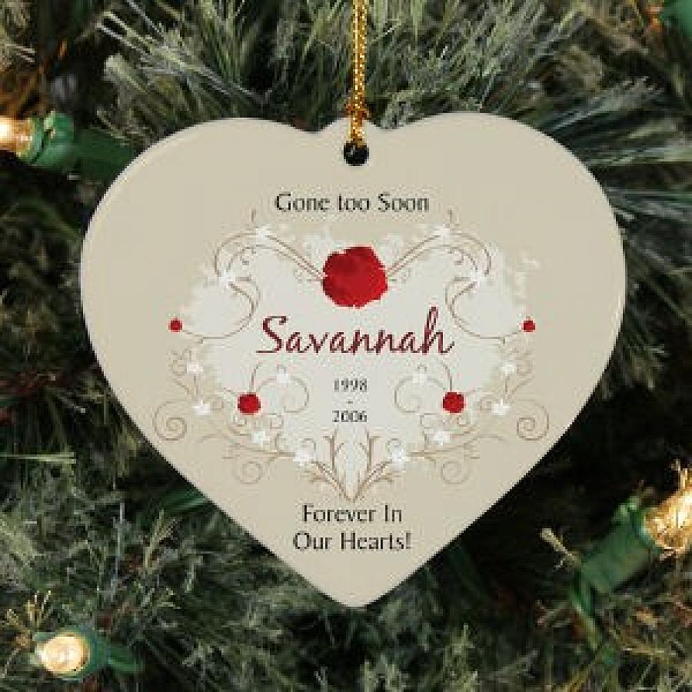 Personalized Ceramic Heart Gone Too Soon OrnamentLet special memories last forever in your heart with this beautifully Personalized Memorial Christmas Ornament.