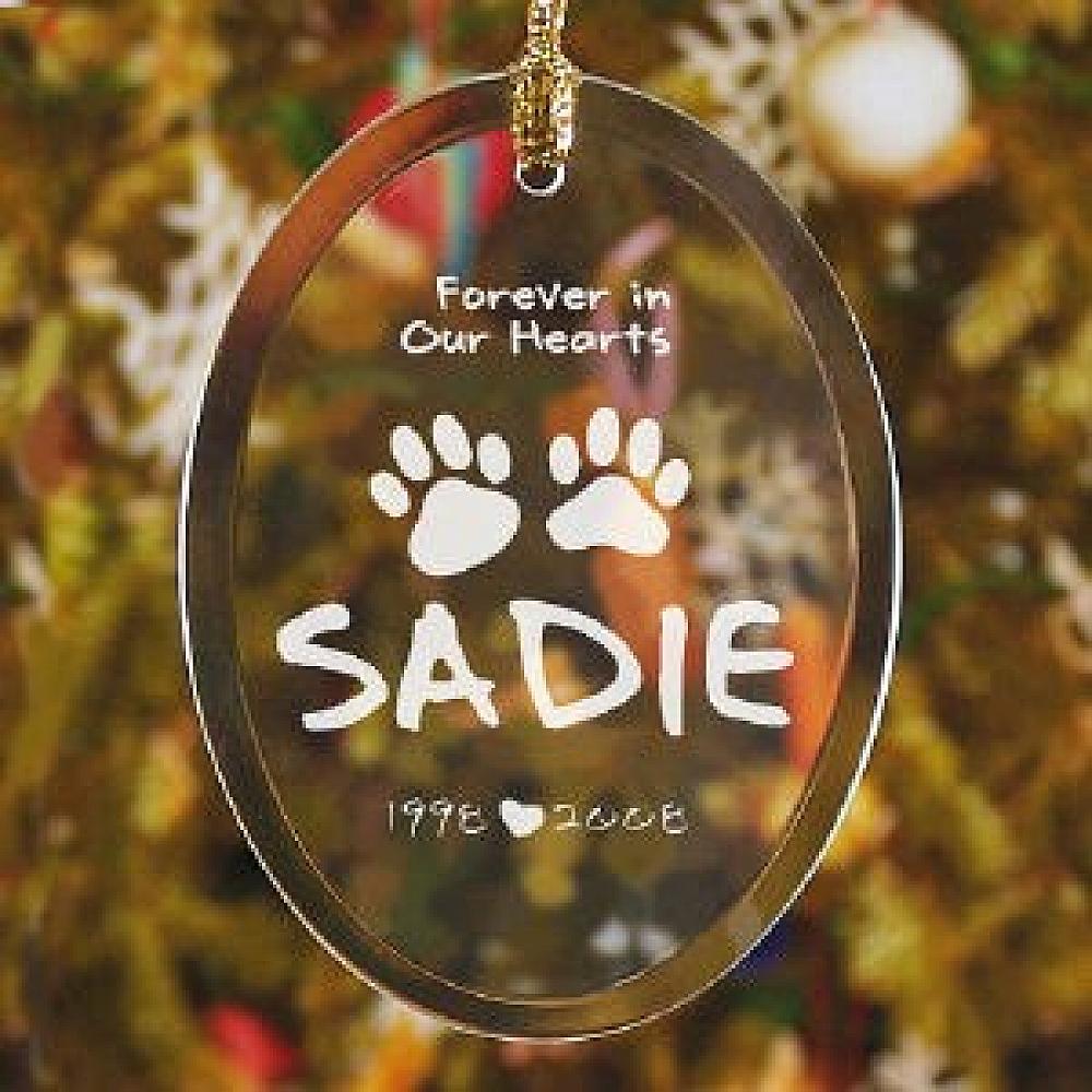 Our Personalized Glass Ornaments are a perfect and beautiful way to remember your pet. Each ornament measures 3 3/4 in x 2 3/4 in and includes a loop of golden ribbon and a free gift pouch. Your ornament will be laser engraved with the date and name you choose.