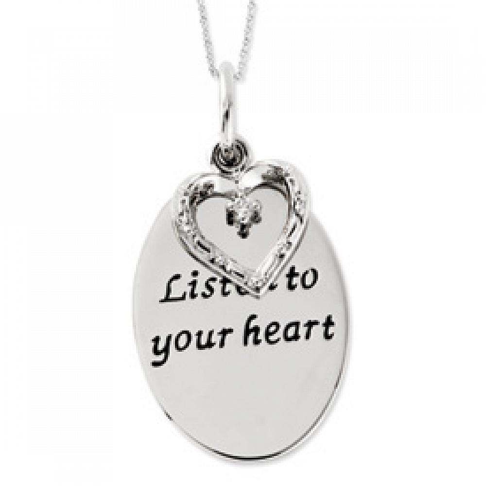 This sterling silver necklace has an 18" chain with a pendant inscribed "Listen to you heart". A beautiful heart charm is attached. This is a wonderful gift idea for someone who needs encouragement when making one of life's many difficult decisions. The inspirational necklace comes with the following quote: