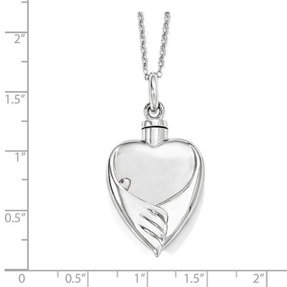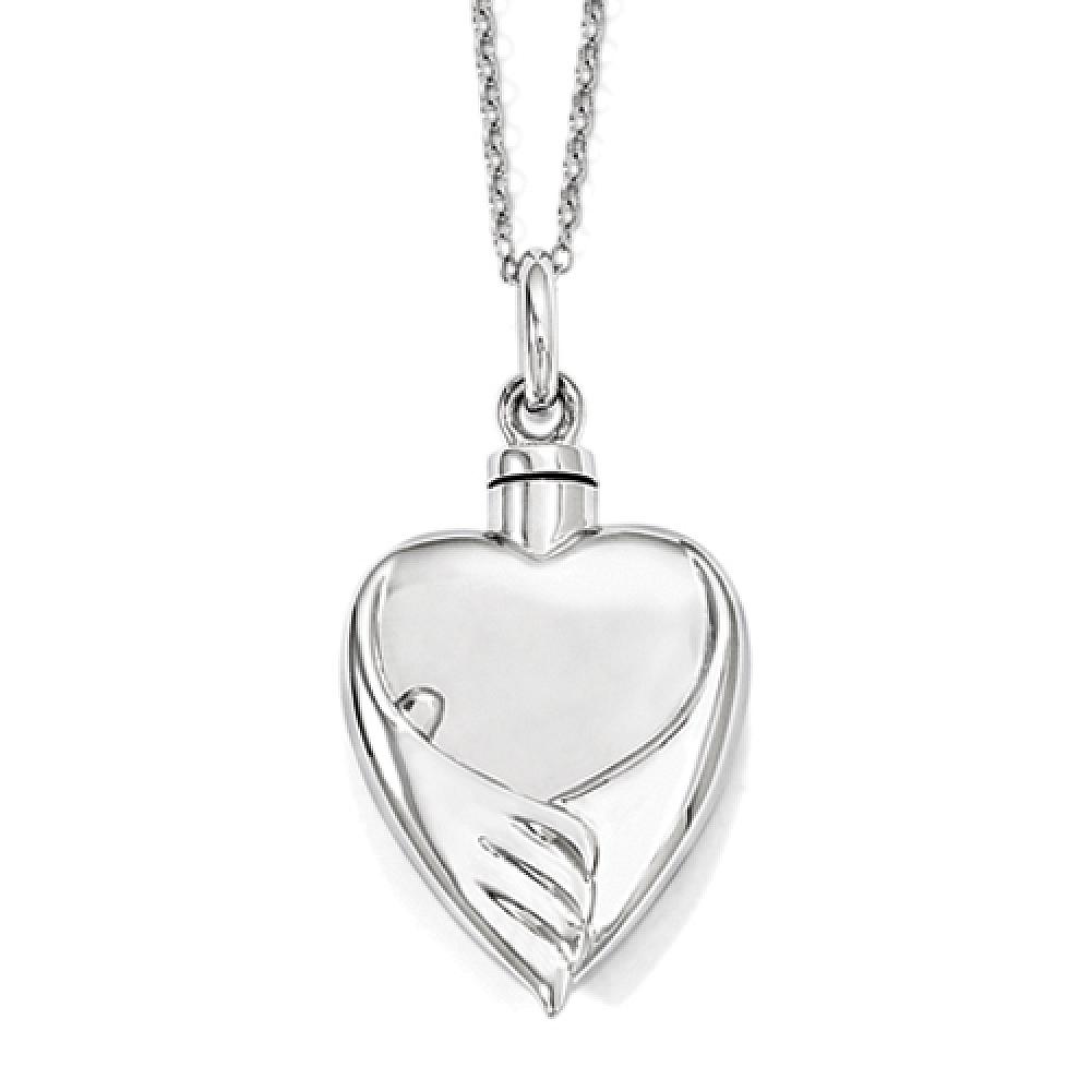 The pendant is designed in a comforting hugging heart shape — arms wrapped around the most precious thing imaginable, holding on and never letting go. Crafted in polished rhodium-plated 925 sterling silver, it is a refined, wearable memorial that sits close to the heart exactly where it belongs. The allen wrench screw closure keeps cremated remains securely sealed for confident daily wear. This is our best selling cremation necklace — and it is not hard to understand why.