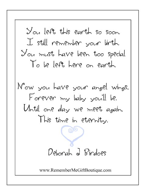 This sterling silver necklace comes with an 18" chain and is packaged in a gift box. Included with this necklace is a very sentimental poem. This is a wonderful Memorial Gift Idea for someone who has lost their baby.