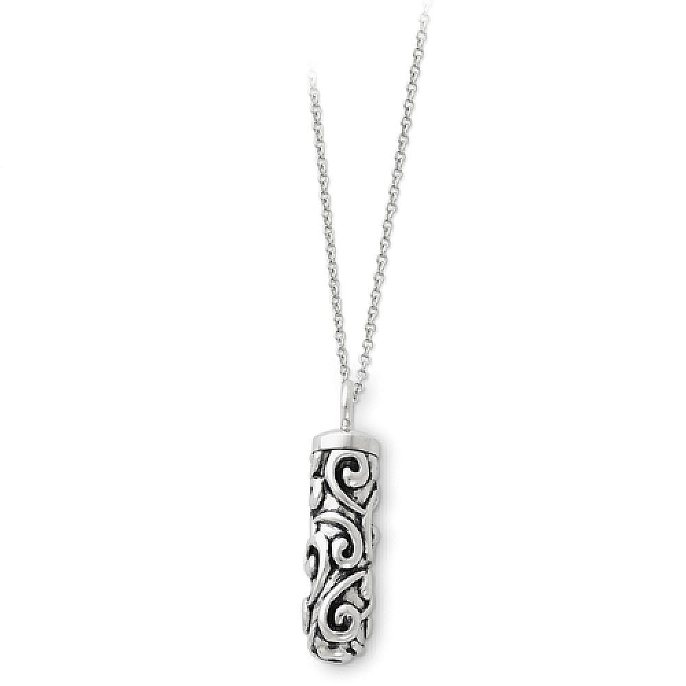 This Antiqued Sterling Silver necklace comes with an ash holder pendant cylinder design. This comes with an 18" sterling silver necklace and a gift box which includes the following: